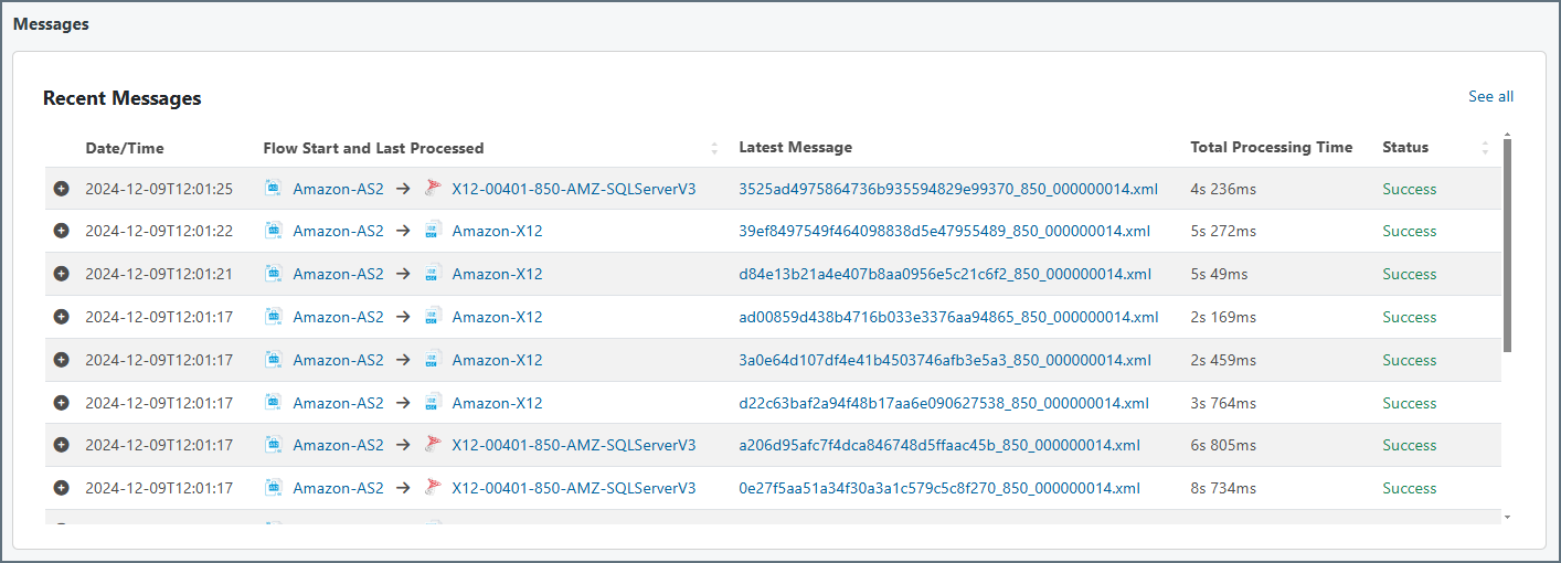This is a simplified view of what you see on the Activity > Messages tab. It displays the 25 most recent messages. Click the See all link to go to the Messages tab and view the full list. See Messages Tab for details.