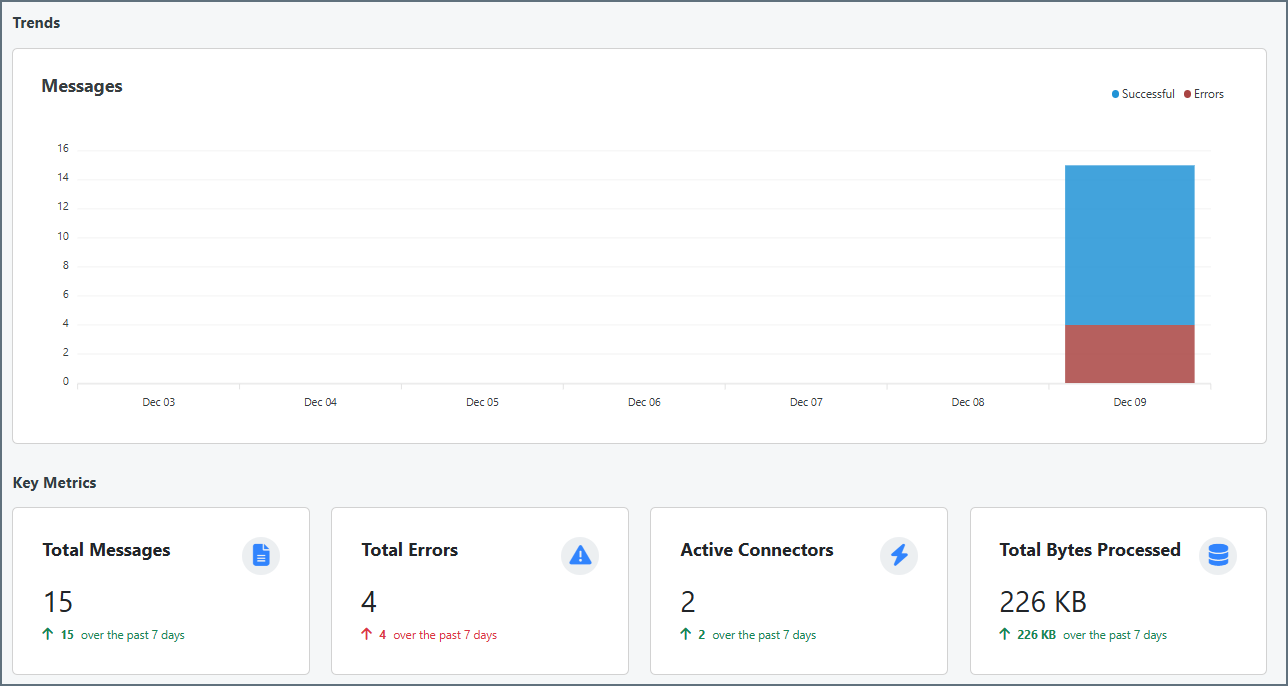 Each trading partner has its own dashboard, which is the EDI Partners landing page. By default, it displays metrics for the last 7 days, but you can use the Show data for dropdown to select your preferred time period. The options are: