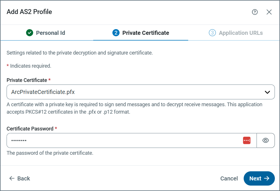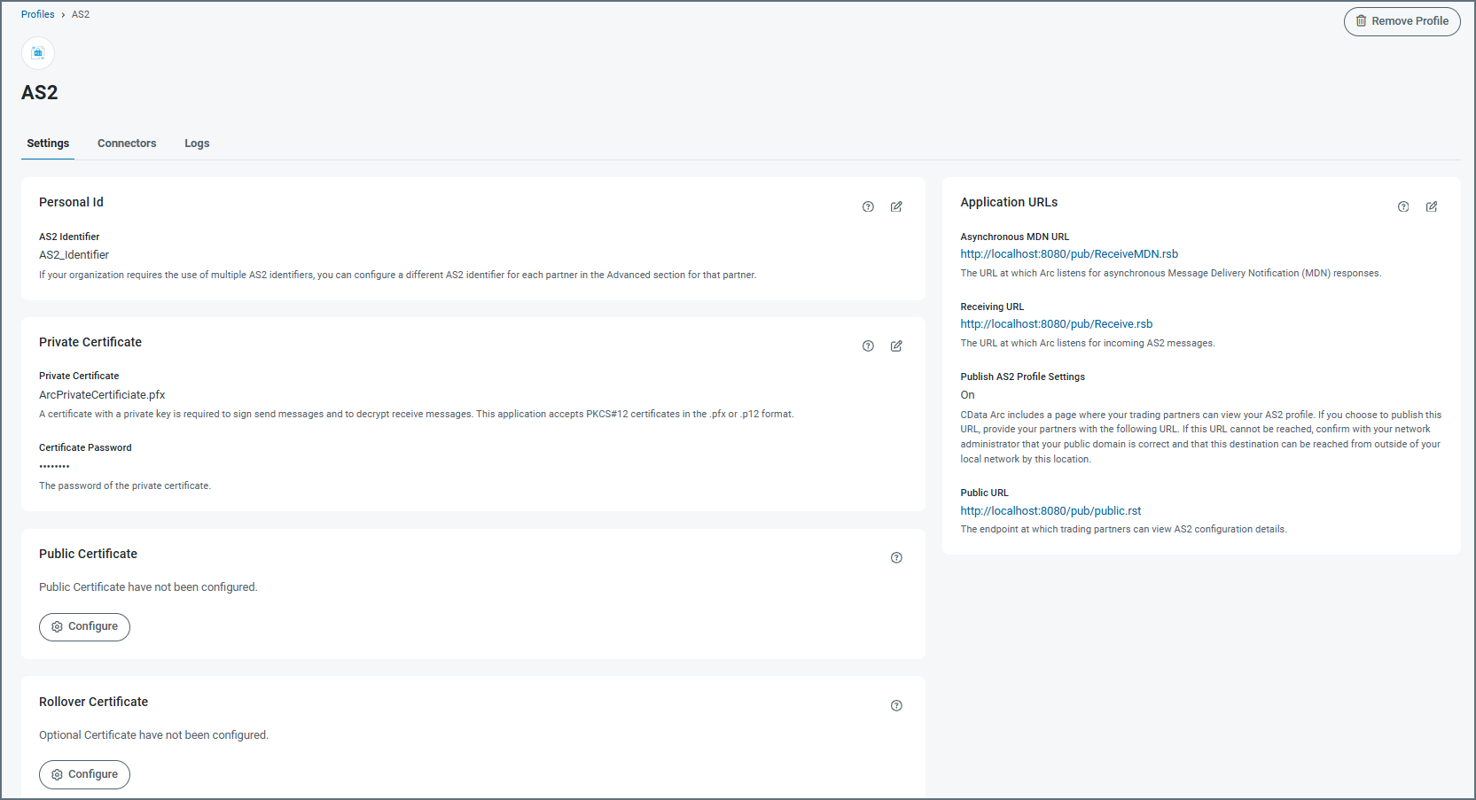 特定のコネクタでは、接続を確立する前にプロファイルを設定する必要があります。プロファイルには、CData Arc がグローバル設定として使用するパートナー接続の設定が含まれます。これらには通常、企業を1つのエンティティとして参照する識別子や、プライベート証明書が含まれます。プロファイルページの設定は、すべての接続で不変の値を表します。