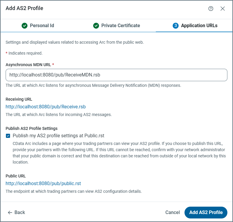 プロファイルの設定をまだ行っていない場合は、カードの設定ボタンをクリックして、設定を完了するために必要な各ステップに従ってください。例えば、AS2 プロファイルの設定には3つのステップがあります: