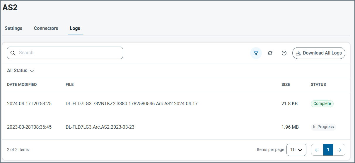 - ログタブには、プロファイルのサービスログのリストが表示されます。ファイル名のリンクをクリックすると、ログファイルの詳細が開きます。ステータスカラムは、ログファイルのローテーションの状態を示しています。進行中は、サービスが現在書き込んでいるログであることを意味し、完了は、ログの更新が終了したことを意味します。