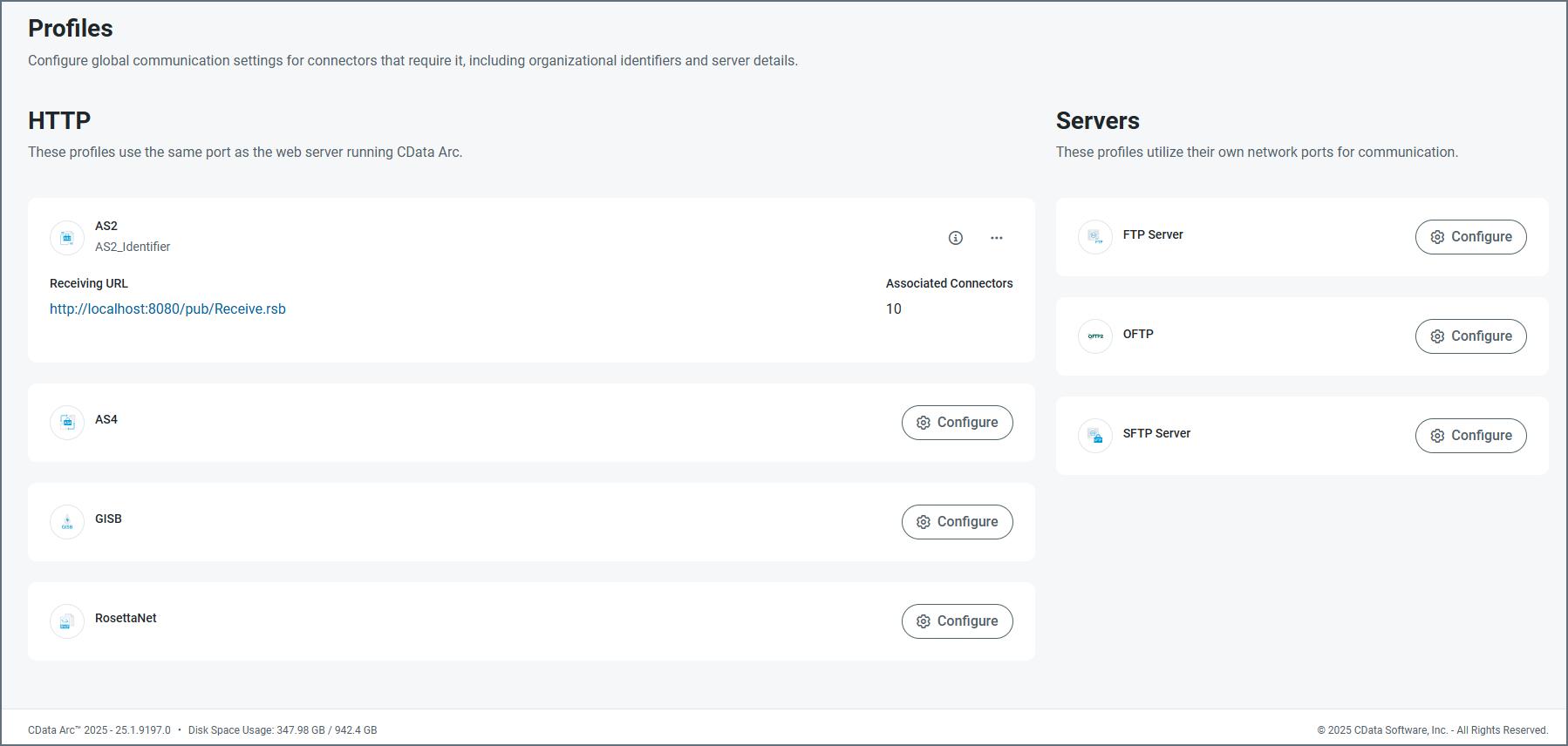 プロファイルページは、HTTP とサーバーの2つのセクションに分かれています。HTTP には、HTTP プロトコルを介してトラフィックを送受信するコネクタのプロファイルが含まれています。サーバーには、異なるプロトコルを介して(例えば、SFTP サーバーはSSH プロトコルを使用)トラフィックを送受信するコネクタのプロファイルが含まれています。