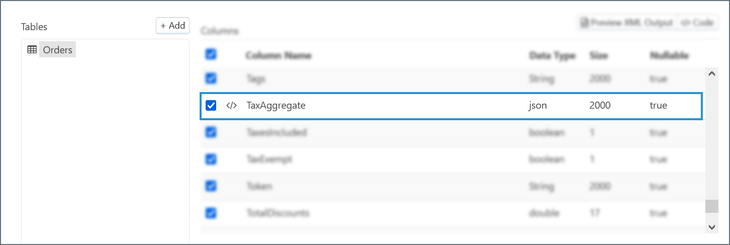 Some columns appear in the QuickBooks Online connector with the XML aggregate icon </> next to their names. In contrast to a standard single-element column, an aggregate column contains a collection of entities. The following screenshot shows an aggregate column in a Select-configured QuickBooks Online connector:
