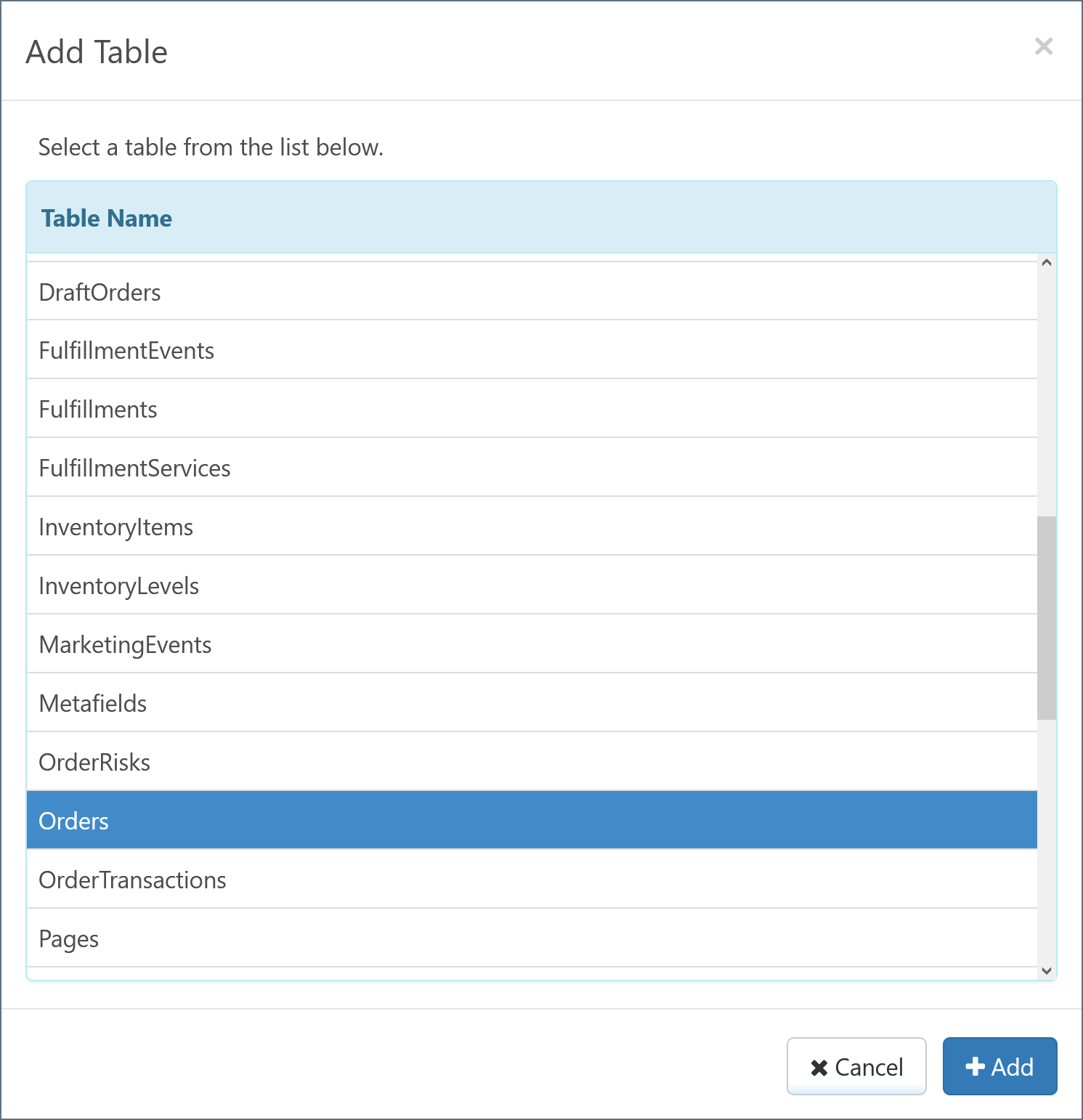 A modal appears and lists all available tables. Select the desired table and click Add.