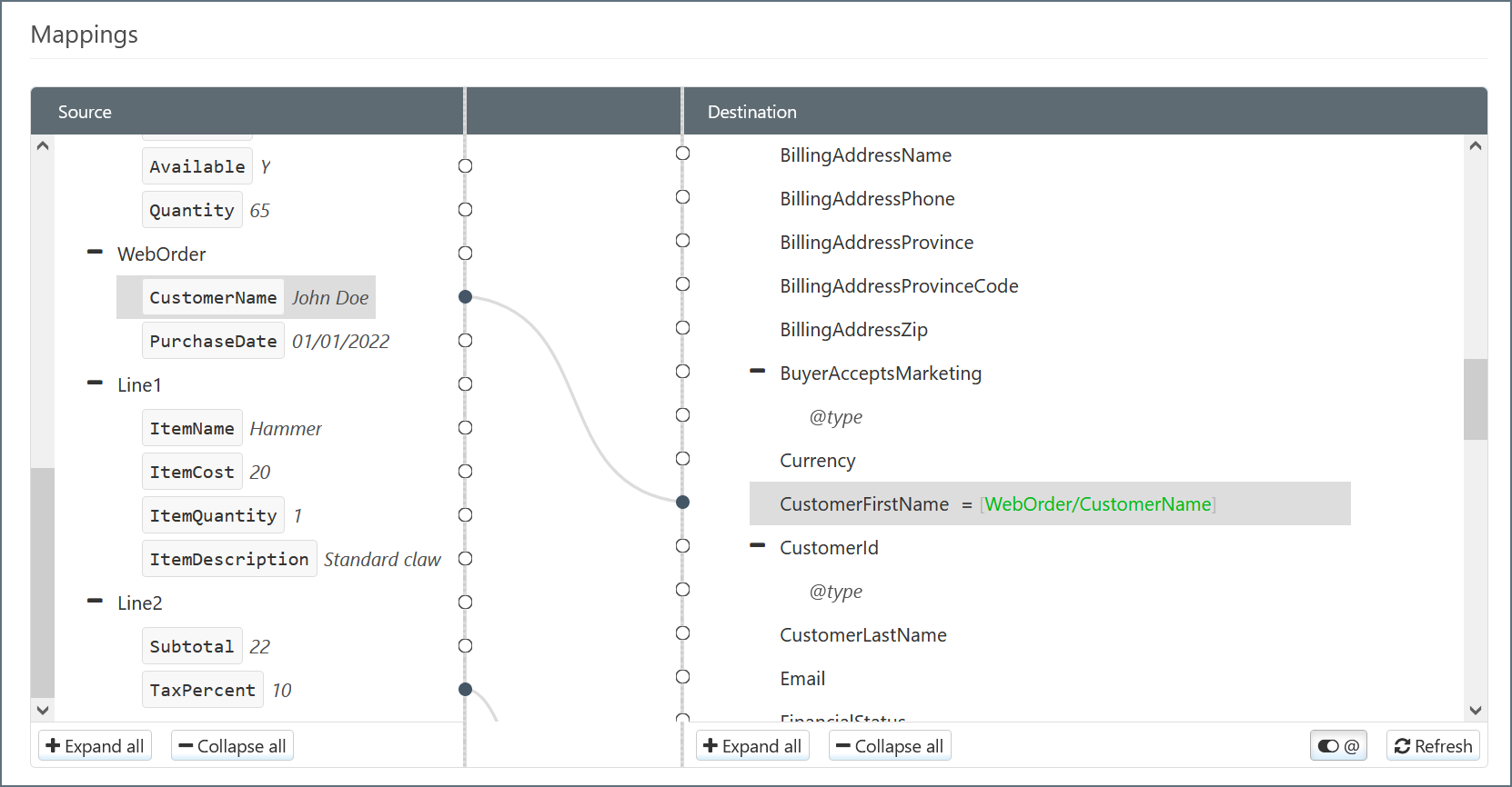 The XML_Map connector attempts to automatically map Source elements to Destination elements with the same name. You can manually change these and fill in blank mappings by dragging elements from Source to Destination.