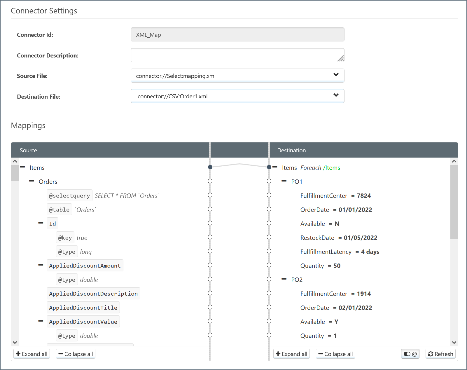 This data passes to the XML_Map connector as the Source File, which maps to the Source tree.