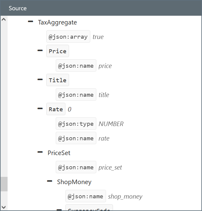 In an XML Map connector, the full structure of the aggregate column expands to display all of its contents. The following screenshot shows an aggregate column expanded: