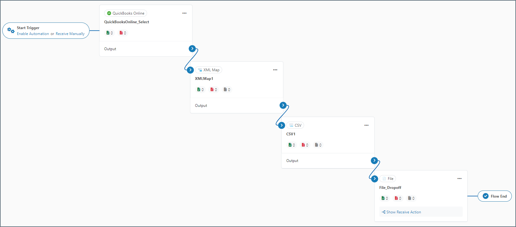 After you choose the tables and columns for the Select-configured QuickBooks Online connector, place the connector at the beginning of an Arc flow. The screenshot below depicts an example flow with a QuickBooks Online Select connector, an XML Map connector, a CSV connector, and a File connector at the end: