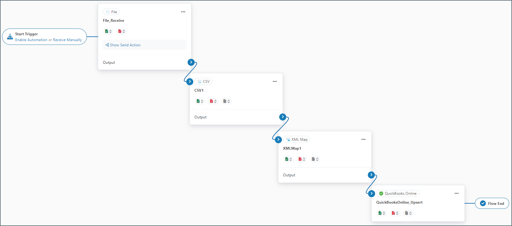 After you choose the tables and columns for the Upsert-configured QuickBooks Online connector, place the connector at the end of an Arc flow. The screenshot below depicts an example flow with a CSV connector, an XML Map connector, and a QuickBooks Online Upsert connector at the end: