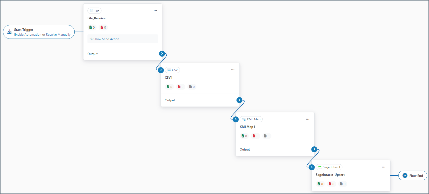 After you choose the tables and columns for the Upsert-configured Sage Intacct connector, place the connector at the end of an Arc flow. The screenshot below depicts an example flow with a CSV connector, an XML Map connector, and a Sage Intacct Upsert connector at the end: