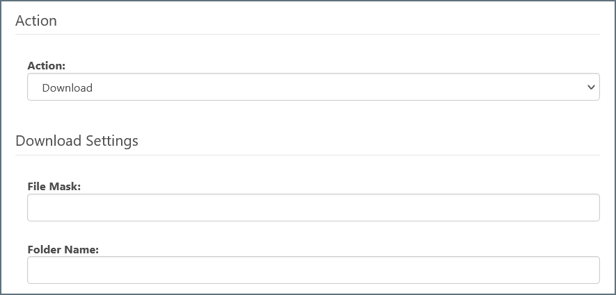In the connector configuration pane, enter a File Mask and a Folder Name. Files that match those criteria are then downloaded when the connector attempts to receive files.