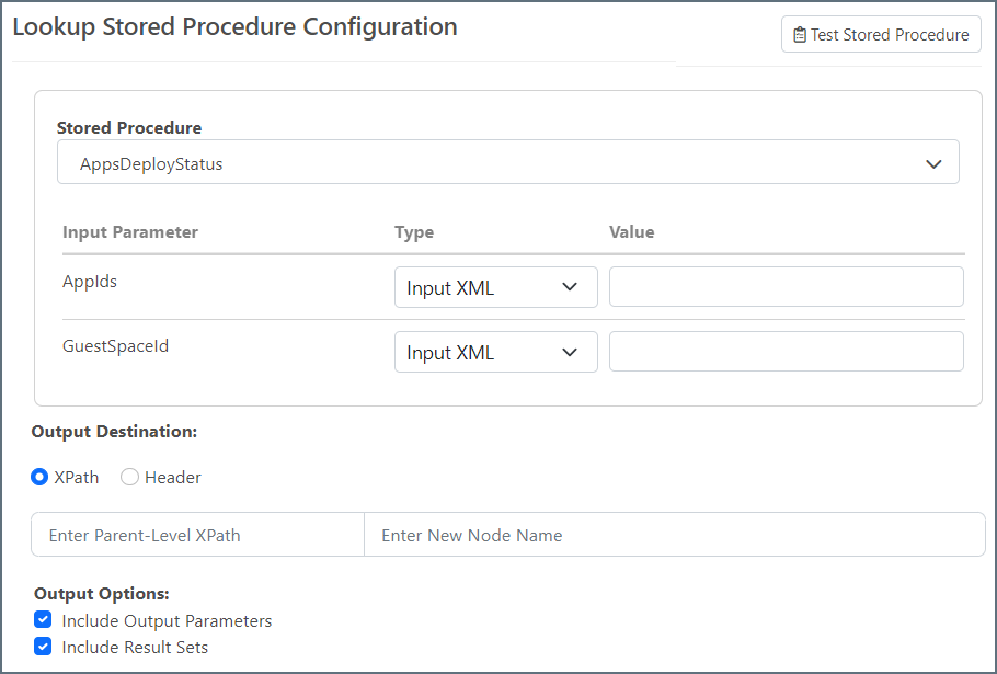- アウトプットデスティネーション:ストアドプロシージャの応答値をXML ファイルに挿入するにはXPath を選択し、ストアドプロシージャの応答値をメッセージヘッダーに挿入するにはヘッダーを選択します。