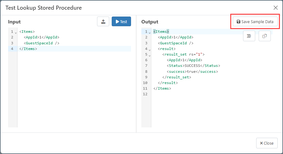 テストをクリックして、生成されるアウトプットを確認します。テスト結果に問題がなければ、サンプルデータを保存をクリックし、他のコネクタからデータにアクセスできるようにします。