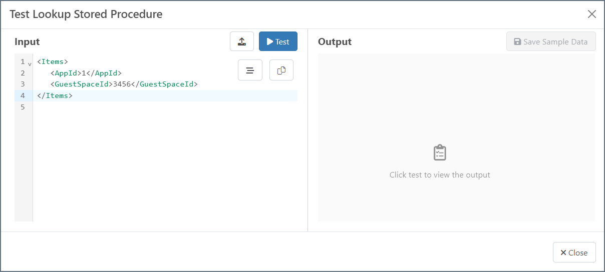 ストアドプロシージャをテストをクリックして、インプットXML の構造を確認します。
