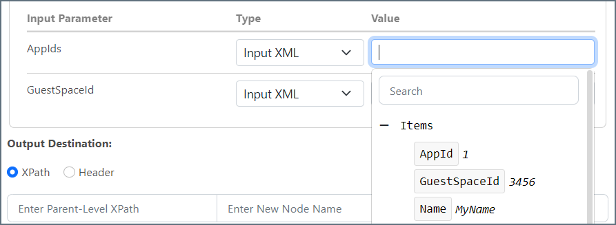 - XPath:XPath を選択すると、デスティネーションは2つの部分に分かれます。親レベルのXPath は、XML ドキュメントにすでに存在している必要があります。新しいノード名は、ルックアップの結果を保持するためにXMLドキュメントに挿入されるノードの名前です。各インプットパラメータ値は、ここで提供されるXML 要素の中に独自のXML 要素(リーフレベル)を持ちます。