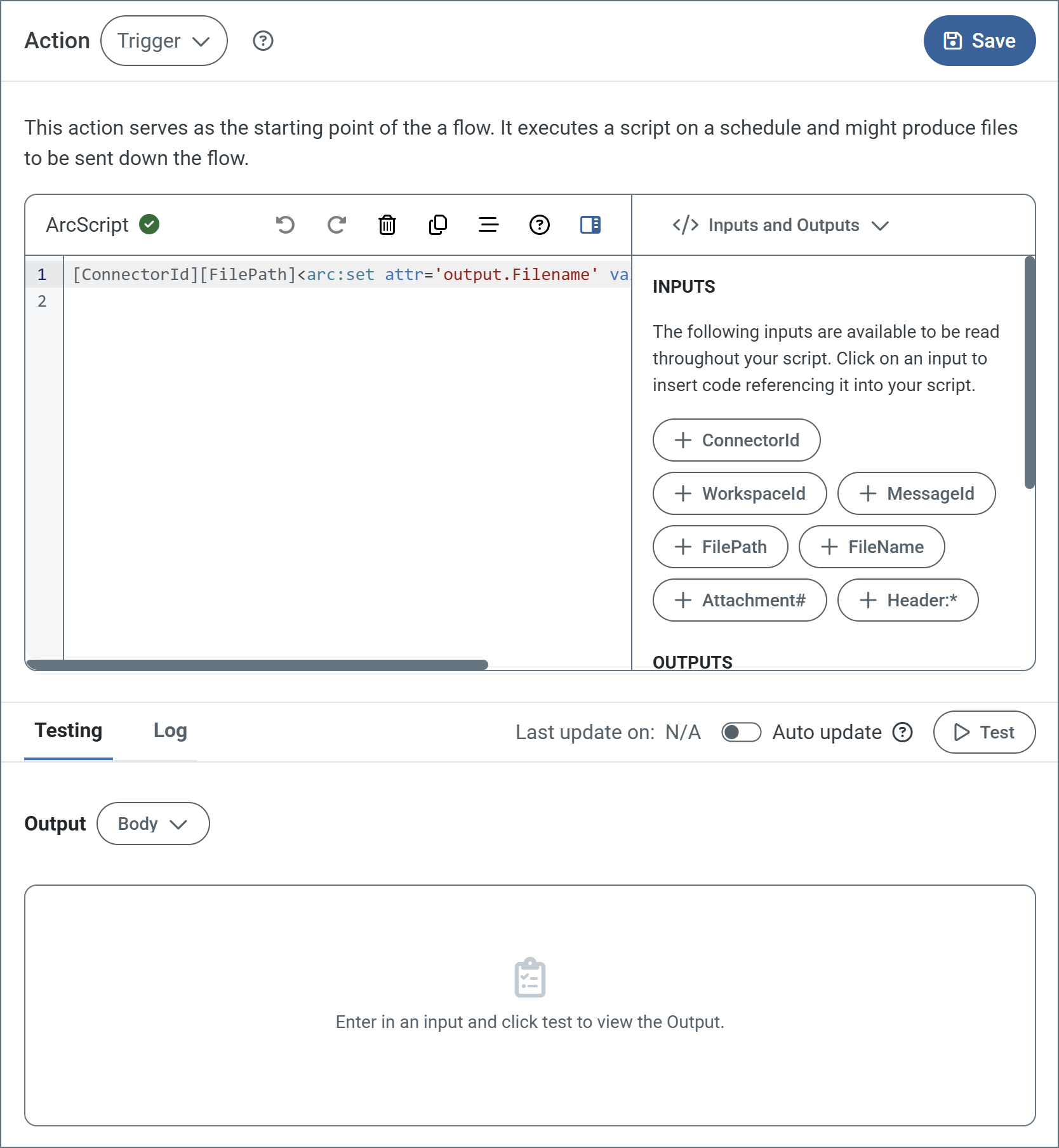 - Testing tab Specify whether to view the script input and/or output as the message body or headers. Options on this tab vary based on the script’s action type (for example, trigger scripts do not have inputs). Click Test to test the script.