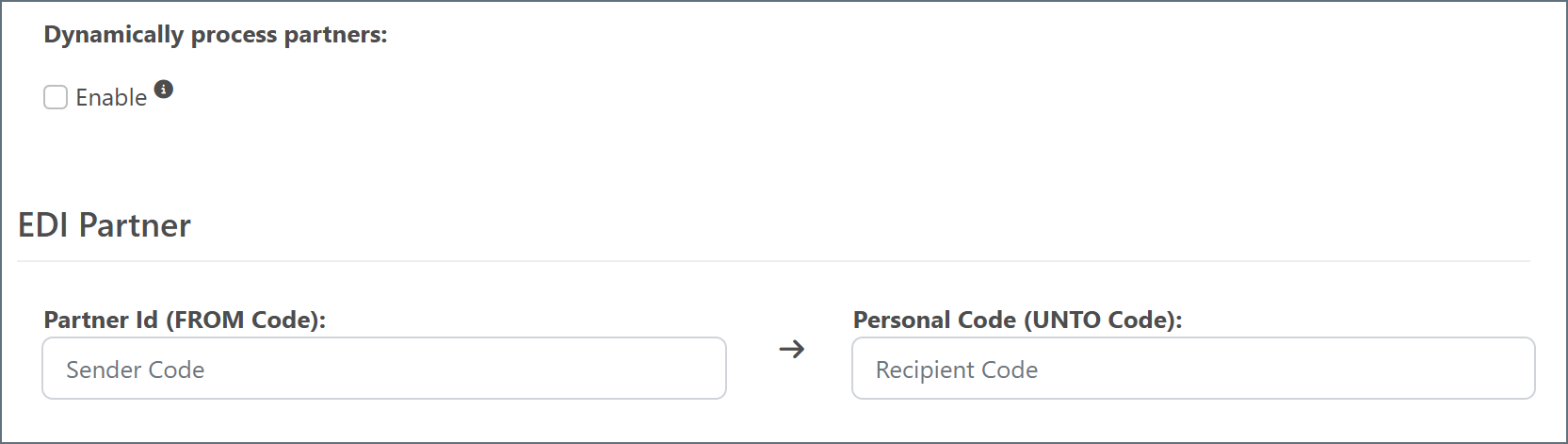 - Dynamically process partners When enabled, the connector automatically identifies and tracks trading partner relationships from EDI transactions. When disabled, you must manually define the partner relationship. See Defining Trading Partner Relationships for more information.