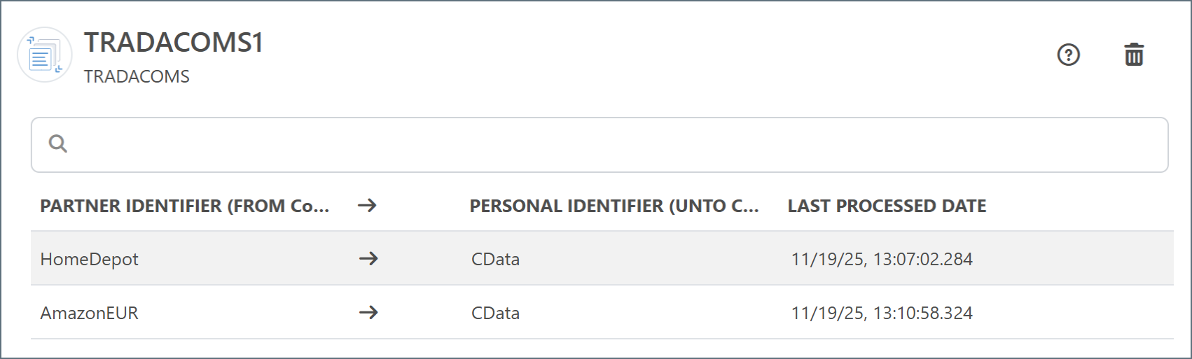 The EDI Partners tab in the connector’s configuration tabs is only enabled when Arc is dynamically processing partners. It is populated with the partner and personal identifiers of each relationship that the connector identifies, as well as the last processing date of a file for that partner. You can delete partners whose last processed date is more than 30 days ago in the EDI Partners tab by hovering over the partner and clicking the bin icon.