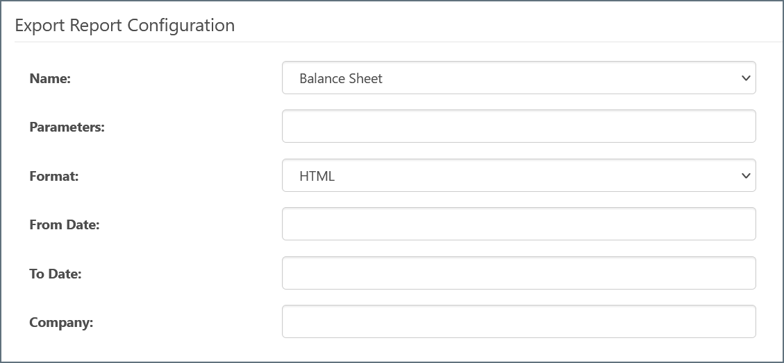 In the configuration pane for the Tally connector, select the item in the Name list that corresponds to the report type, then select the desired Format. The other fields are optional and can be filled out as required.