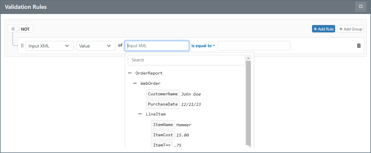 Input XML is only considered valid if all validation rules (or groups of rules) are satisfied. If the XPath configured in a rule is not found in the input XML, the validation automatically fails. In other words, if the connector is unable to read a value for a rule’s XPath, the input file does not pass the rule.