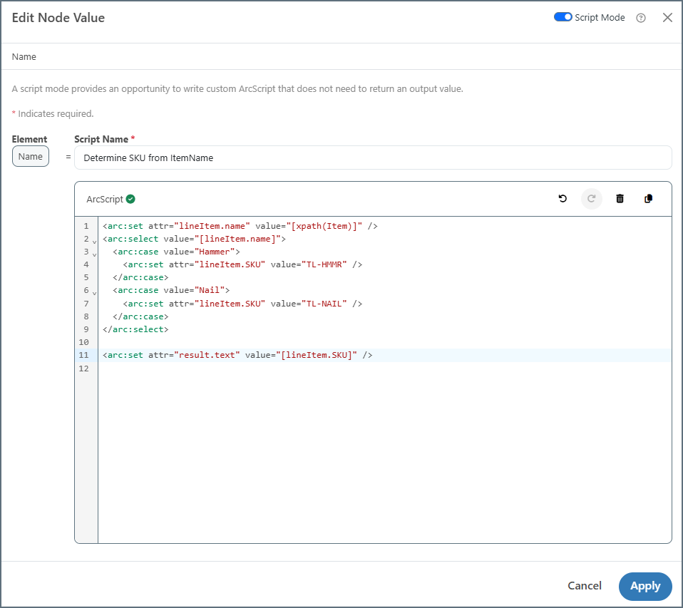 For example, you can use a script to determine the SKU for an item based on the item’s name. A simple way to accomplish this is to use a select/case statement in combination with the XPath formatter to check the ItemName element of the input XML: