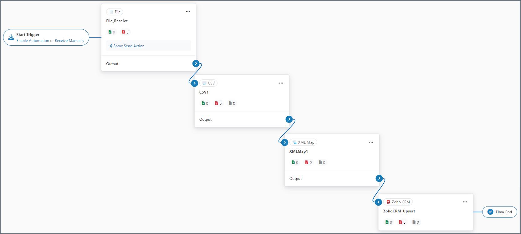 After you choose the tables and columns for the Upsert-configured Zoho CRM connector, place the connector at the end of an Arc flow. The screenshot below depicts an example flow with a CSV connector, an XML Map connector, and a Zoho CRM Upsert connector at the end: