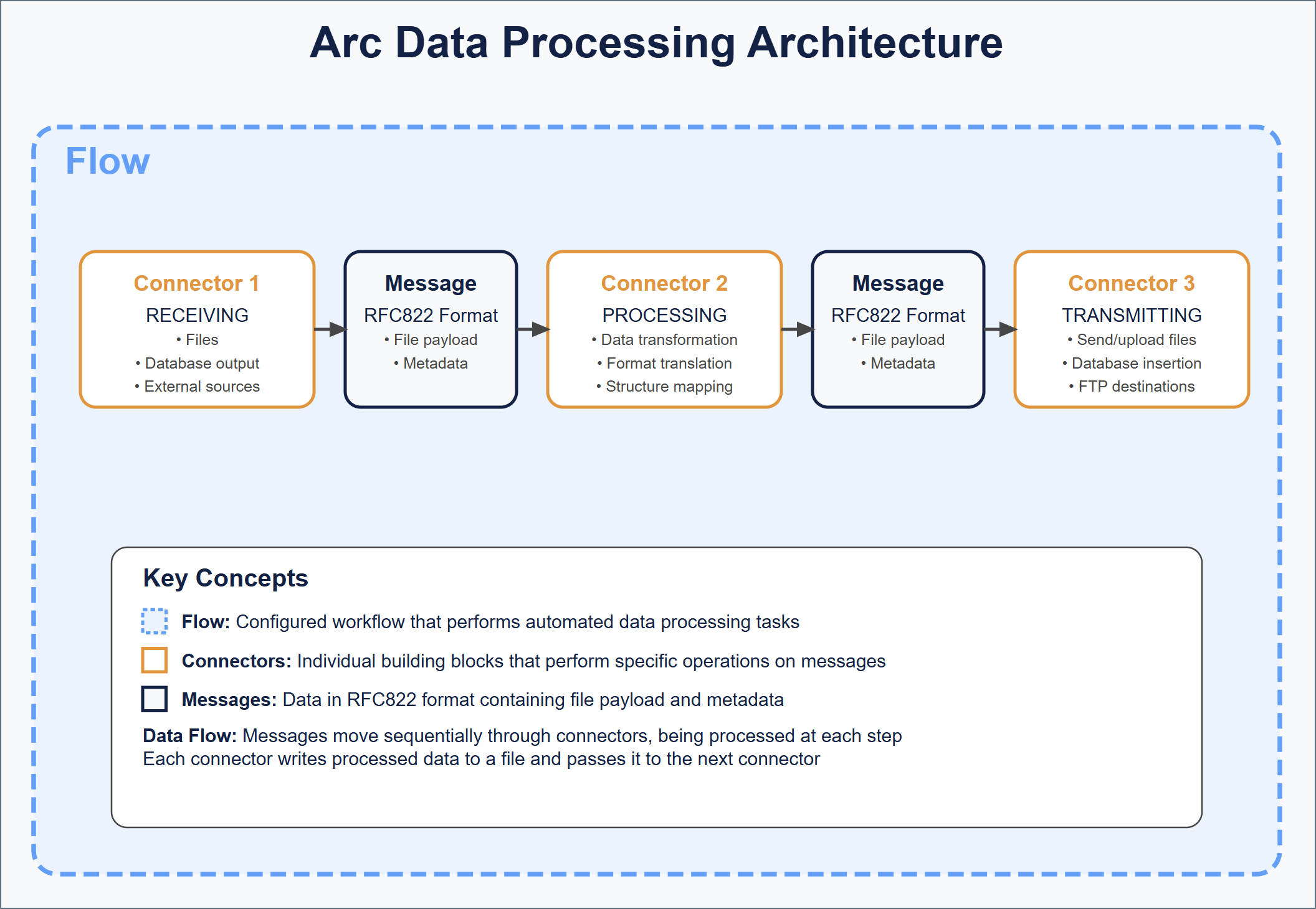 When data is passed between connectors in a flow, it is passed in the form of a message. Messages consist primarily of file payload data (the data that Arc is processing) and metadata (information that Arc uses to track the flow of data through the application).