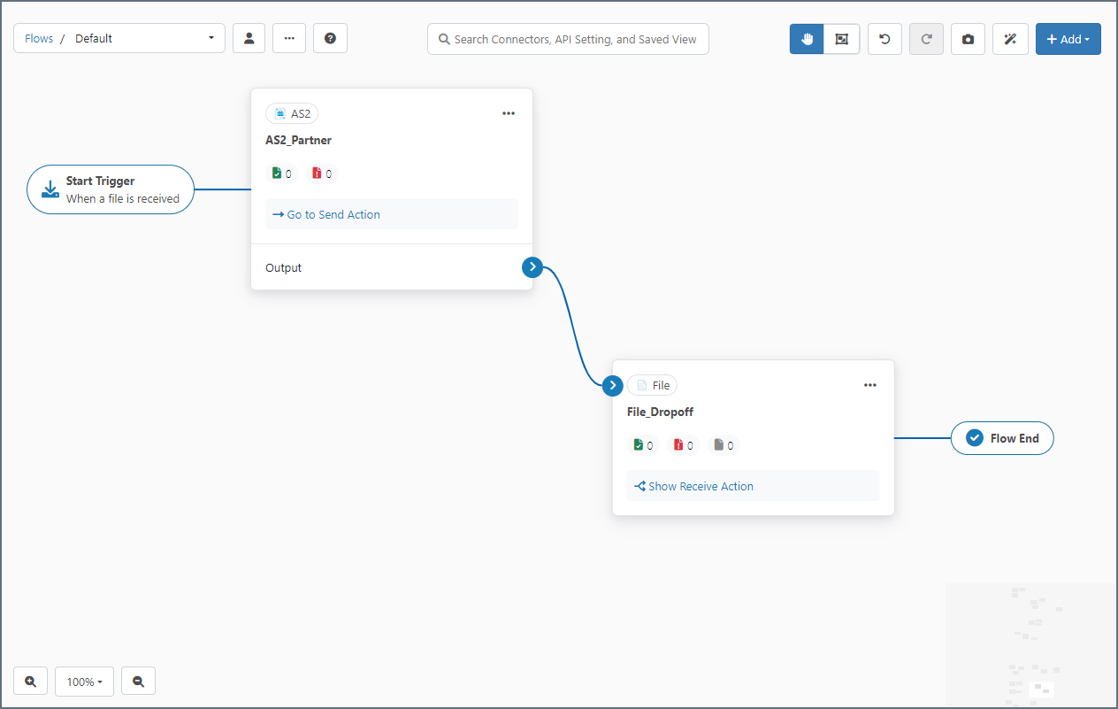 Some connectors, such as AS2 and SFTP, either receive data from an external party or server or send data out to an external party or server (or both). These connectors are typically at the start or the end of a flow, since that’s where data enters or exits the application.