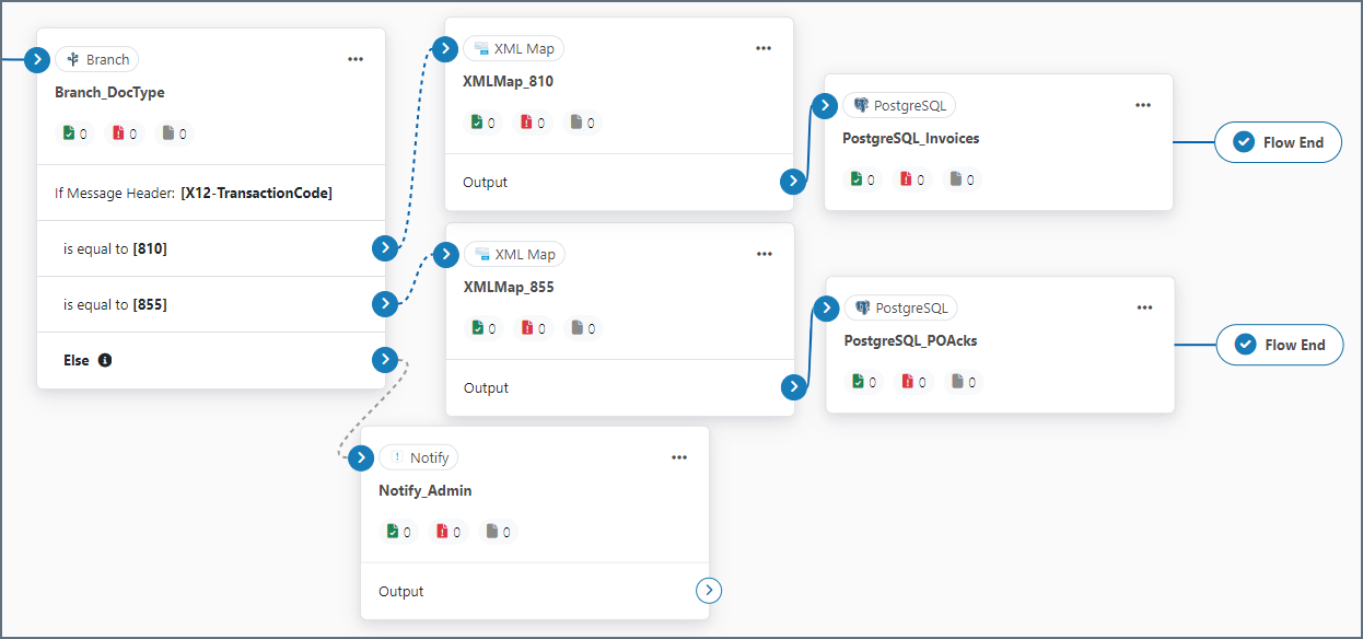 The image above illustrates a situation where you send a trading partner purchase orders. They then send you two different types of EDI documents: one is an 855 purchase order acknowledgement and one is an 810 invoice. The X12 connector before the Branch connector in the flow appends X12-TransactionCode to each message header.