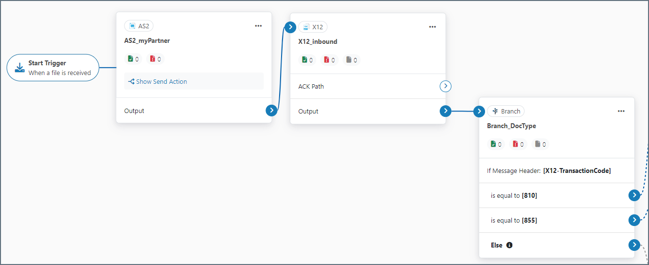 The Branch connector uses the transaction code in the message header to tell Arc what to do when it receives an 810 or an 855 EDI document, and what to do if it receives a document that does not have either of those transaction codes.