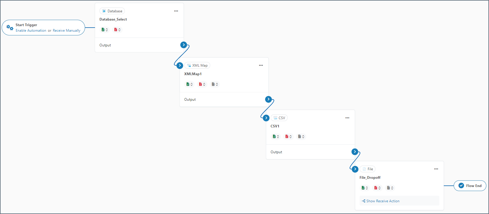 After you choose the tables and columns for the Select-configured Database connector, place the connector at the beginning of an Arc flow. The screenshot below depicts an example flow with a Database Select connector, an XML Map connector, a CSV connector, and a File connector at the end: