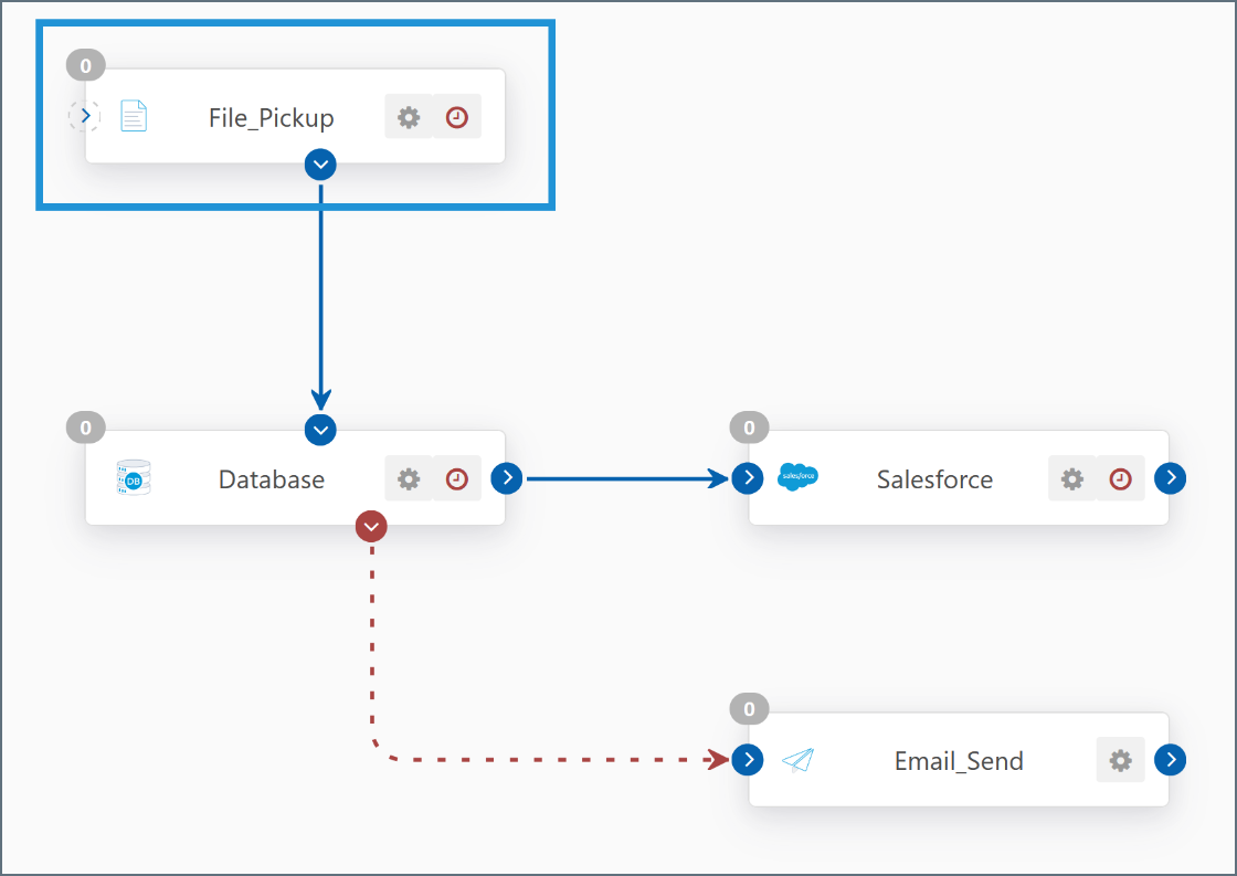 For example, data might enter the flow at an AS2 connector when an external trading partner sends a business document over AS2. The data from this business document might need to be imported into a back-end system like a database. In this case, the AS2 connector and the Database connector are the entry and exit points for the flow.