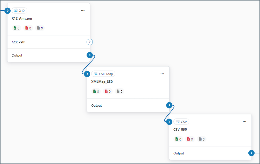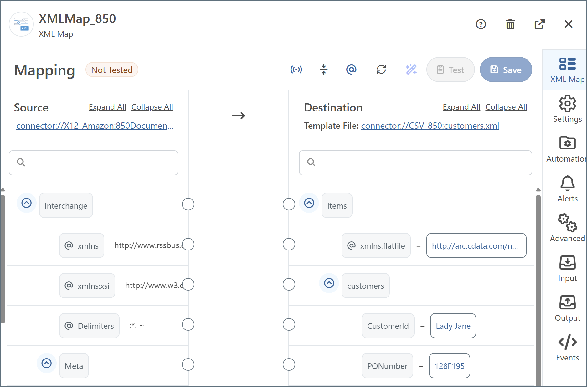 Now that the X12 connector and CSV connectors have generated XML models of the source and destination documents, use the XML Map connector to transform one XML structure into the other.