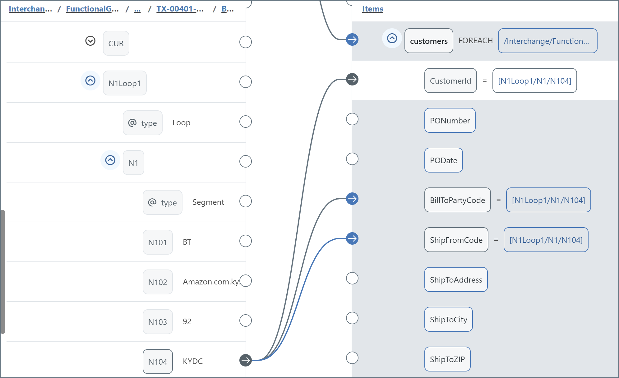 The 850 document contains multiple N1Loop1 elements representing a party in the exchange and the role of that party (for example, ship-to party or bill-to party). For each N1Loop1, the N1Loop1/N1/N104 element holds the value that identifies the party (the party name or ID), so these values must be mapped to the output CSV. However, the xpath for each N104 element is the same regardless of the party’s role, so the xpath to the N104 element is not enough to map the correct values.