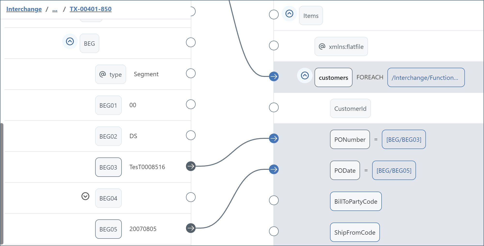 When a value from the source should be directly inserted in the resulting output, simply drag a leaf node from the source onto a leaf node in the destination to map the values. For example, the BEG03 element holds the value for PONumber, which corresponds to the PONumber attribute in the destination: