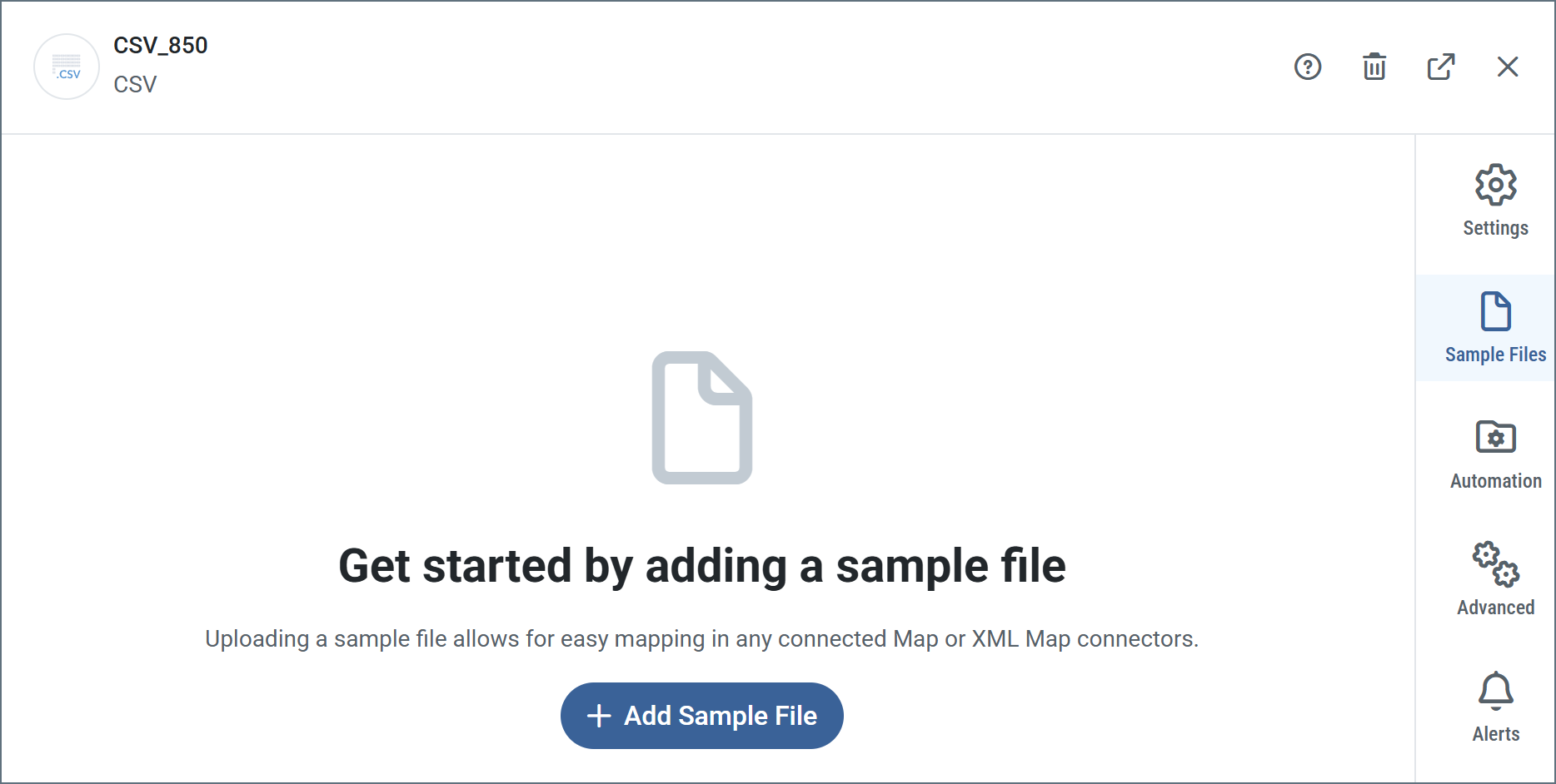 Navigate to the Sample Files tab of the CSV connector and click Add Sample File. If you already have an example CSV file that contains the appropriate columns (and headers if Column headers present is enabled), choose File Upload and browse to your file. Alternatively, select Manually Create to create a CSV file directly in the application. If you choose Manually Create, give your sample file a name. Click Next.