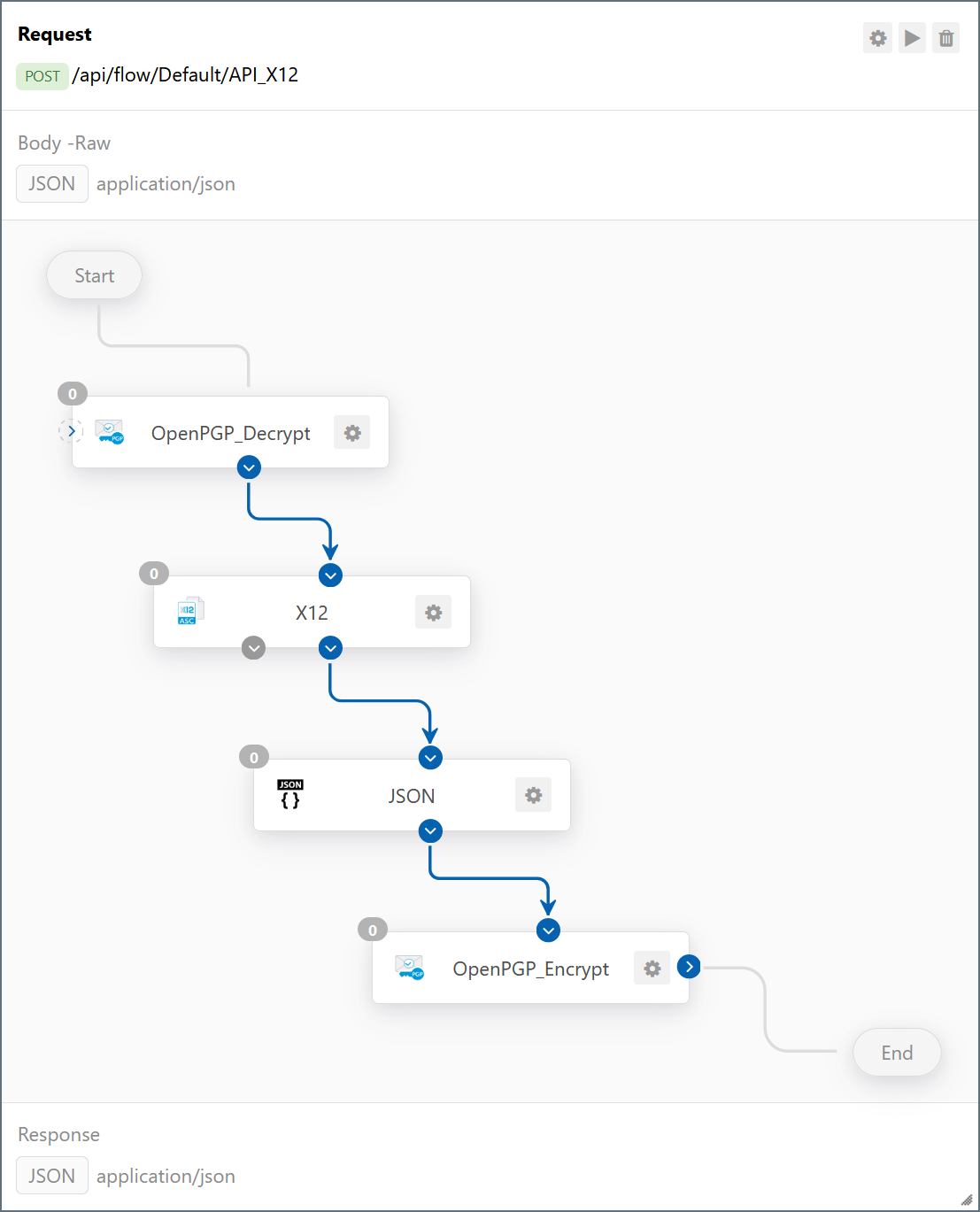 Note: The first connector in the flow API receives input data from the entity issuing the query, and the final connector sends output data back to the entity issuing the query.