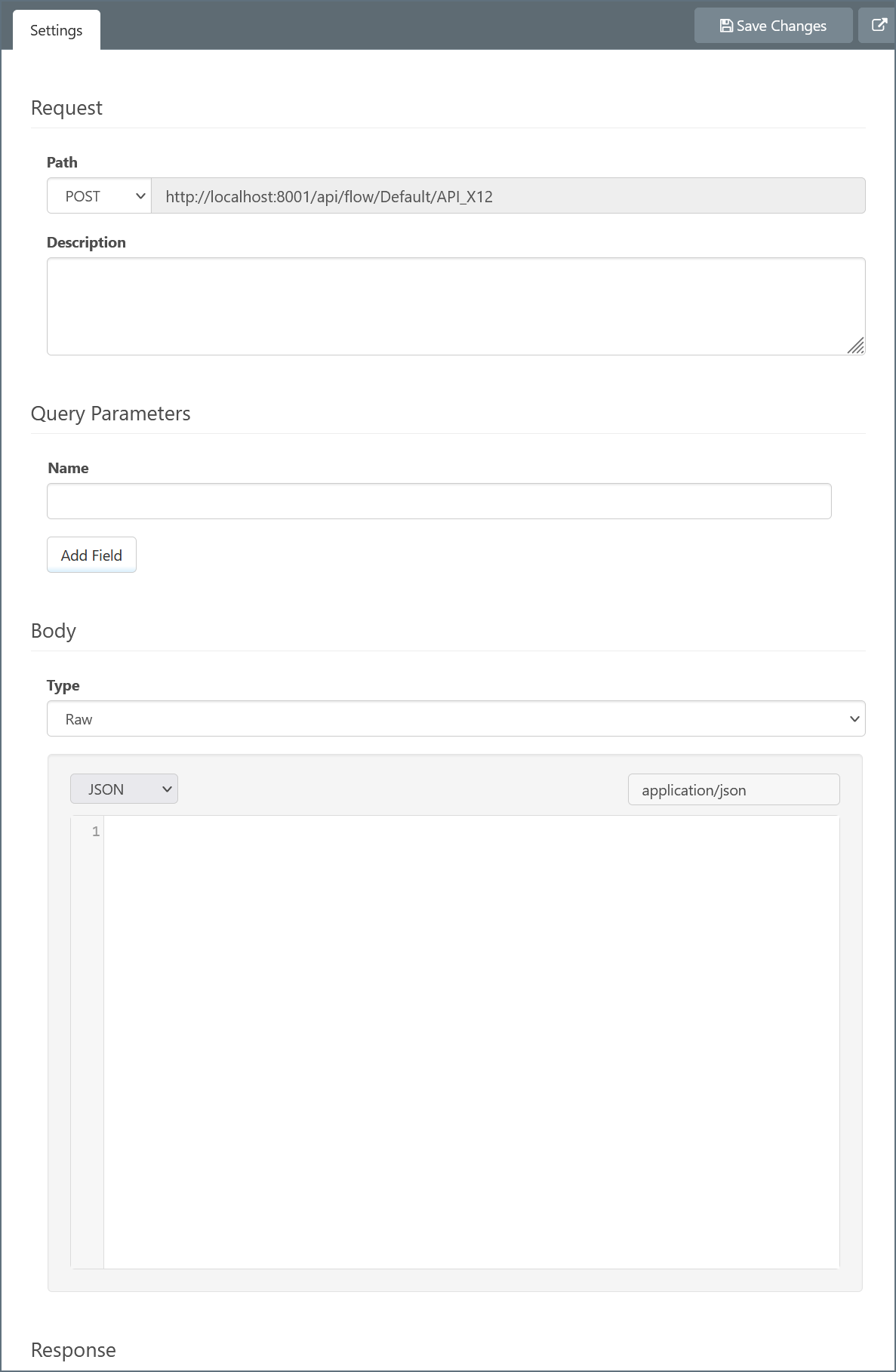 In the Settings pane, configure the Flow API to define the expected Content-Type value in the Body section and the Content-Type value that you want for the response in the Response section. As an option, you can provide sample data for the request and response.