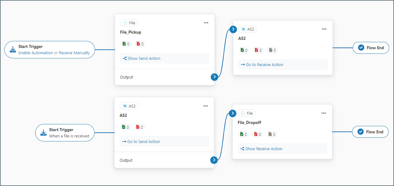 For AS2 connectors, place files that should be sent to external trading partners in the connector’s Send folder, and pick up files that are received from external trading partners in the connector’s Receive folder.