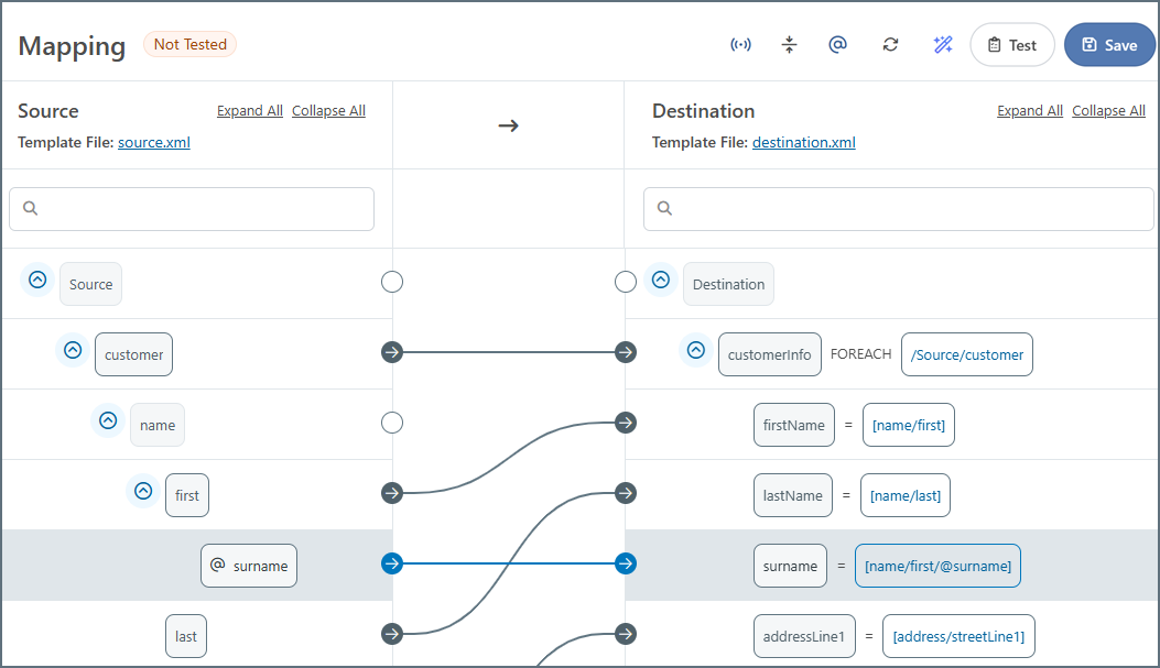 Once a Foreach relationship is established, an xpath appears in the destination, as shown in the image below. Elements at this path in the input XML result in a new instance of the output node and its children. In other words, a Foreach relationship instructs the mapping engine to loop over a given xpath in the source and produce the mapped destination structure for each element it finds. The xpath in the destination tree view is the xpath over which the mapping engine loops.