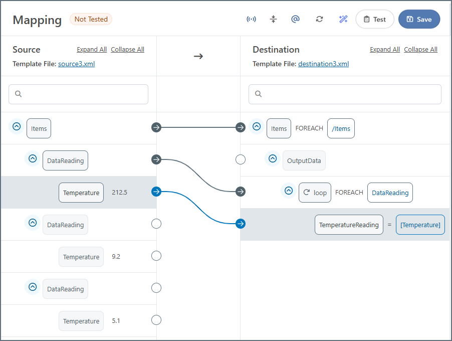 - Map the source Temperature node to the destination TemperatureReading node.
