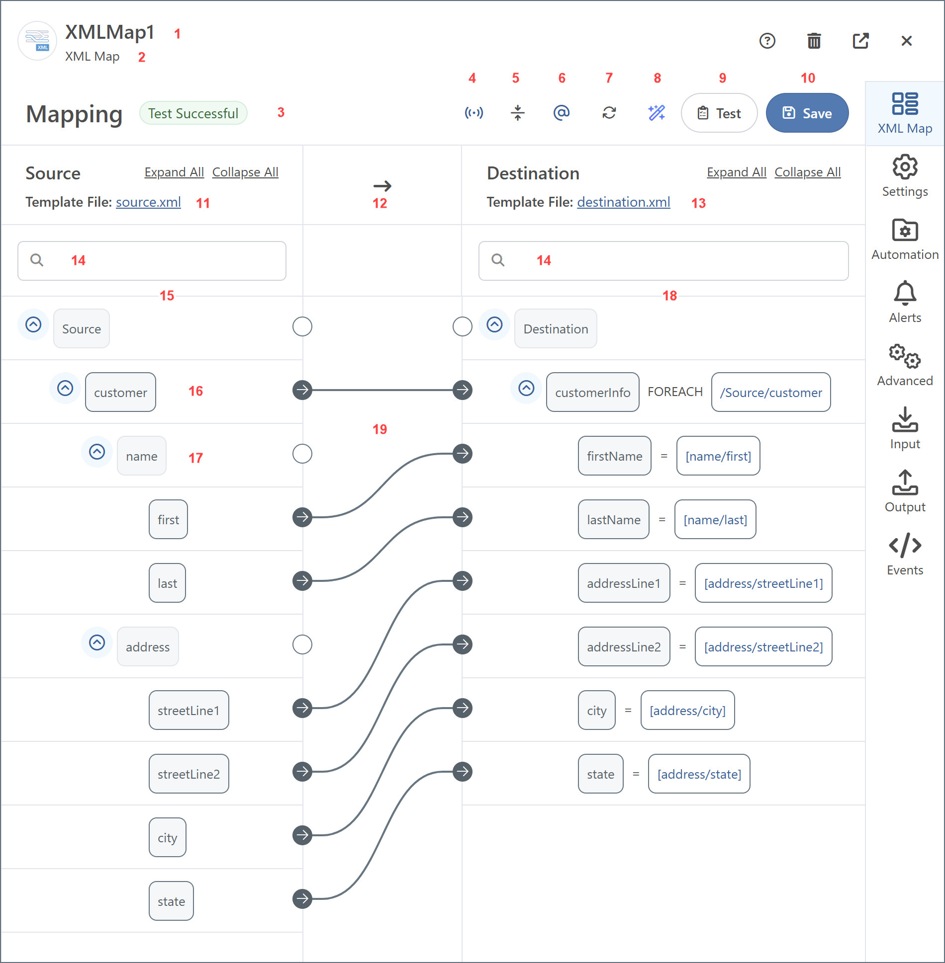 To make this clear, imagine in the Mapping Loops example that the source file (the template for the input XML) had multiple sets of customer element groups. Establishing a single Foreach relationship between customer (source) and customerInfo (destination) ensures that the number of customerInfo element groups matches the number of customer element groups for any input file. Since it only takes one customer element to establish this Foreach relationship, all other customer elements are irrelevant to the mapping and can be ignored or deleted.