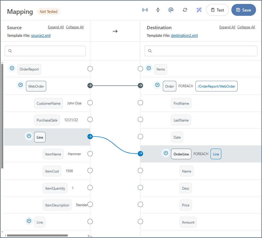Dragging a source parent onto a destination parent establishes a Foreach relationship between the source and destination nodes. This means that each occurrence of the source element produces a corresponding destination element, including all of the destination element’s children.