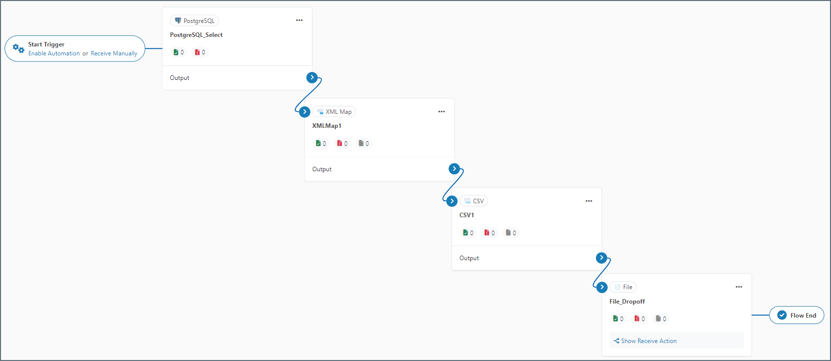After you choose the tables and columns for the Select-configured PostgreSQL connector, place the connector at the beginning of an Arc flow. The screenshot below depicts an example flow with a PostgreSQL Select connector, an XML Map connector, a CSV connector, and a File connector at the end: