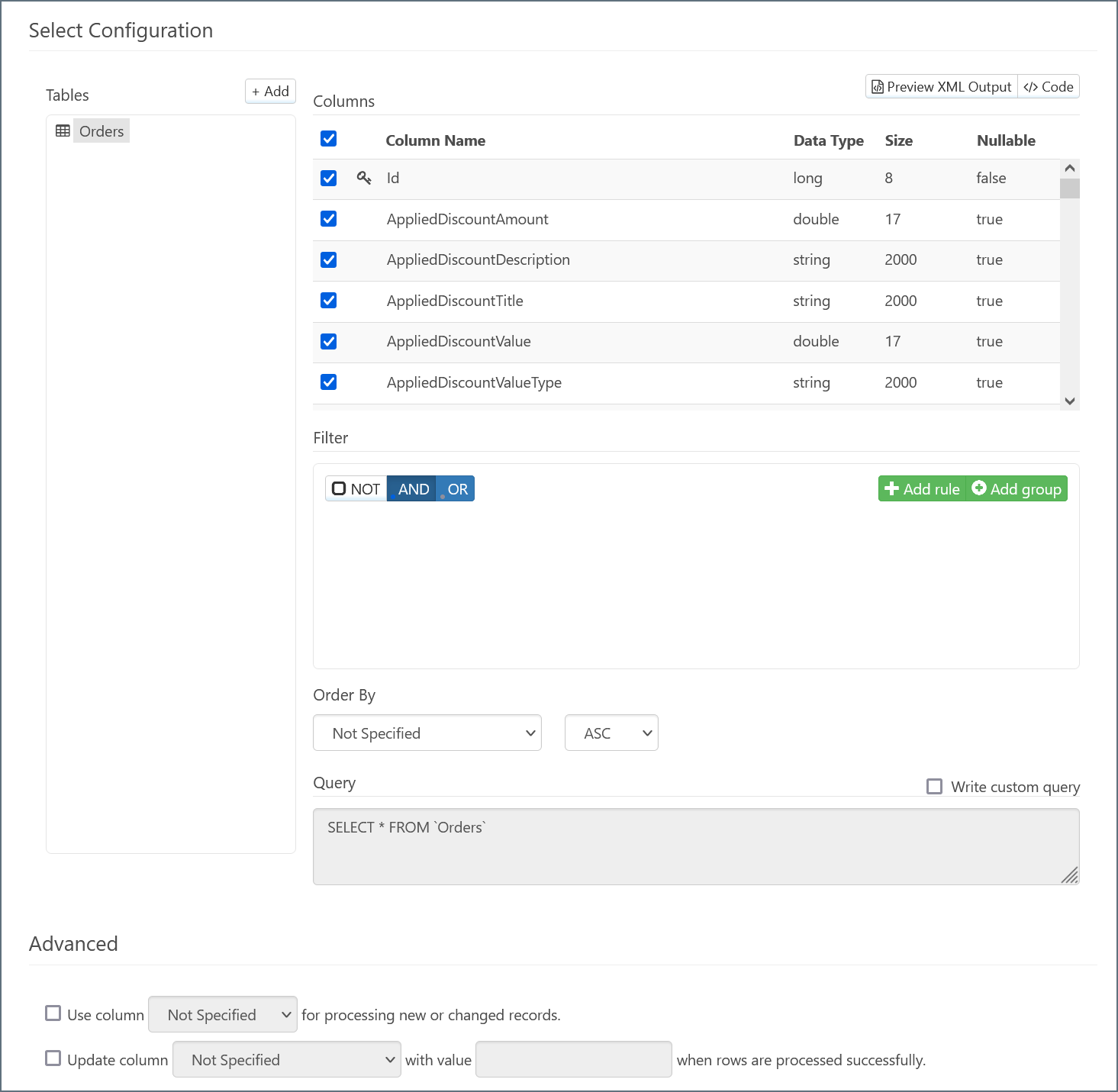 After you select a table, you can optionally use the Filter pane to filter the data that the connector selects. The connector translates your filter rules into query syntax, and the syntax appears in the Query pane at the bottom of the connector configuration page.