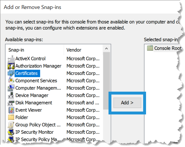 - After adding the snap-in, click Certificates (Local Computer) > Personal > Certificates to display the available certificates. The certificates for which a private key is available have a key icon superimposed over the certificate icon.