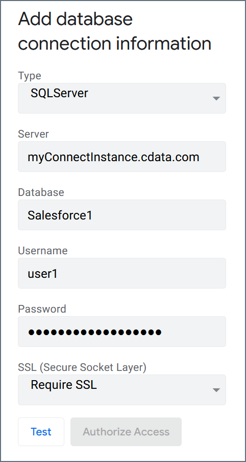 Database—enter the Connection Name of the CData Connect data source you want to connect to (for example, Salesforce1).