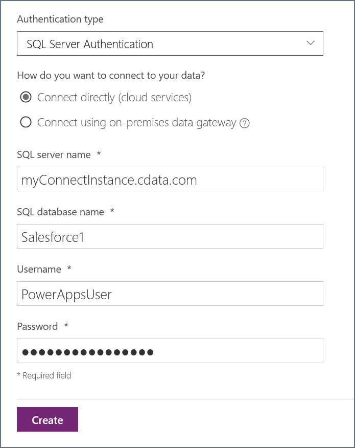 SQL server name—enter the URL from the Microsoft Power Apps connection modal in CData Connect.