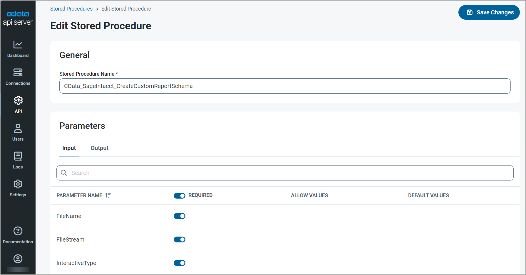 Define whether your input stored procedures as required on the Input tab in the Parameters category. (The Input and Output tabs display the parameters for your input and output procedures.) To set a parameter on the Input tab as required or not required, toggle the global REQUIRED switch in the column-header bar. You can also define individual stored procedures as required or not by toggling the switch in the REQUIRED column for those specific procedures.