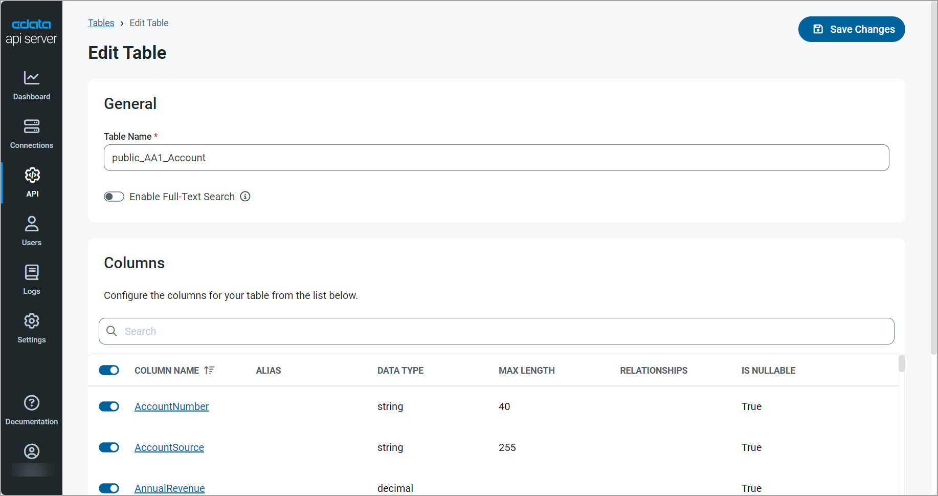 Turn on full-text search by toggling the Enable Full-Text Search to the right. This option enables you to run full-text queries against character-based data in the table.
